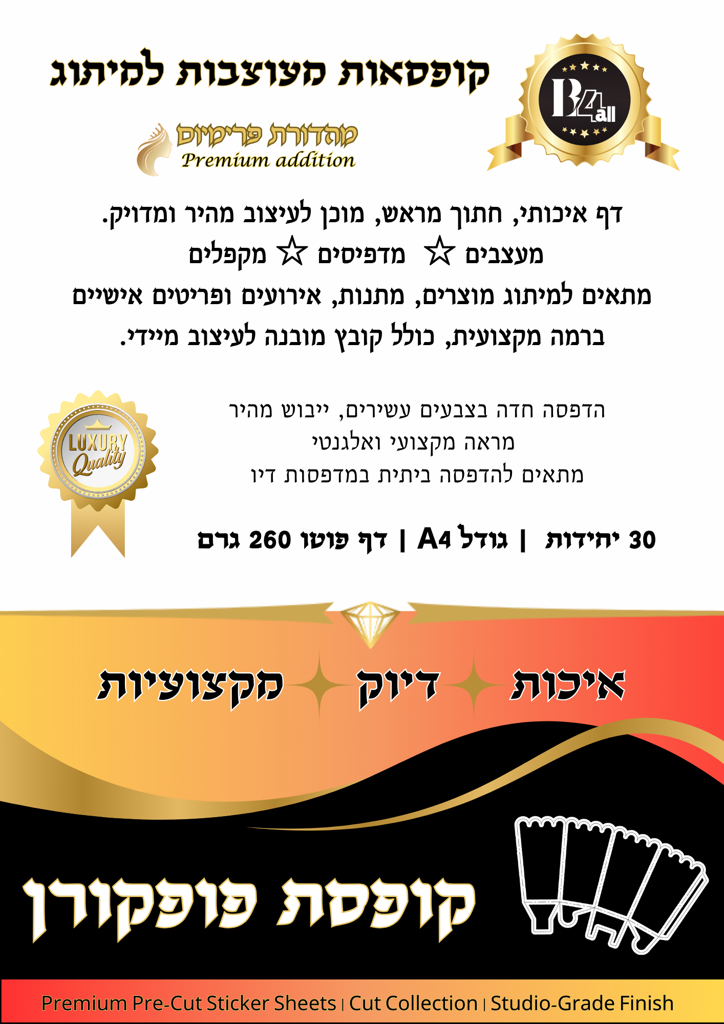 30 דפים במארז- כל דף מעוצב עם פריסה חתוכה מראש וקלה לניתוק, שנבנה במיוחד לעיצוב קופסת פופקורן עם תבנית עיצוב דיגיטלית תואמת- העיצוב מקבל שליטה מדויקת, והתוצאה מרגישה כאילו יצאה מבית דפוס מקצועי.
